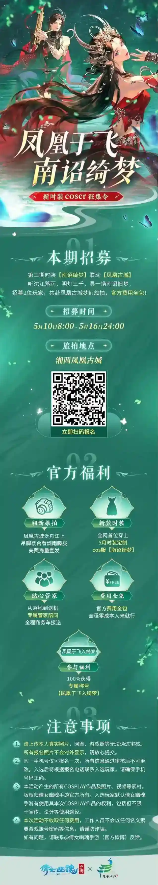倩女幽魂手游将于本月招募2名倩女玩家,身穿南诏绮梦,走入烟雨凤凰。报名成功100%得专属旅拍称号!国风文旅计划第3站凤凰古城正式开启!!!