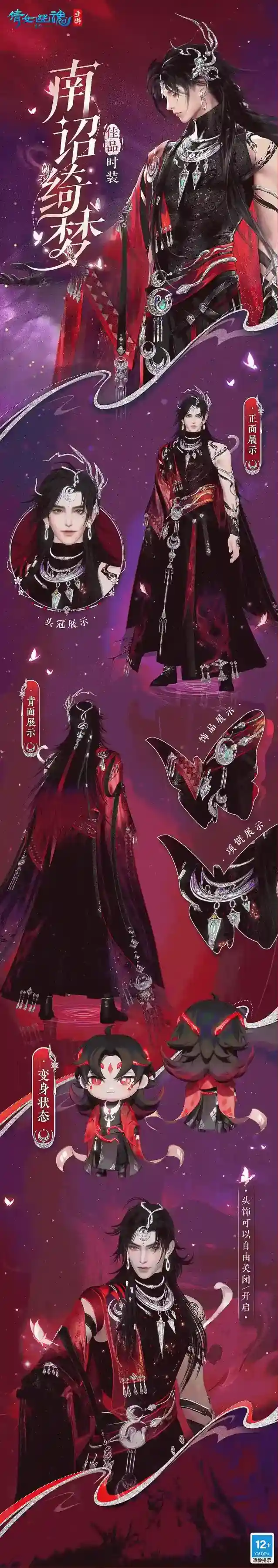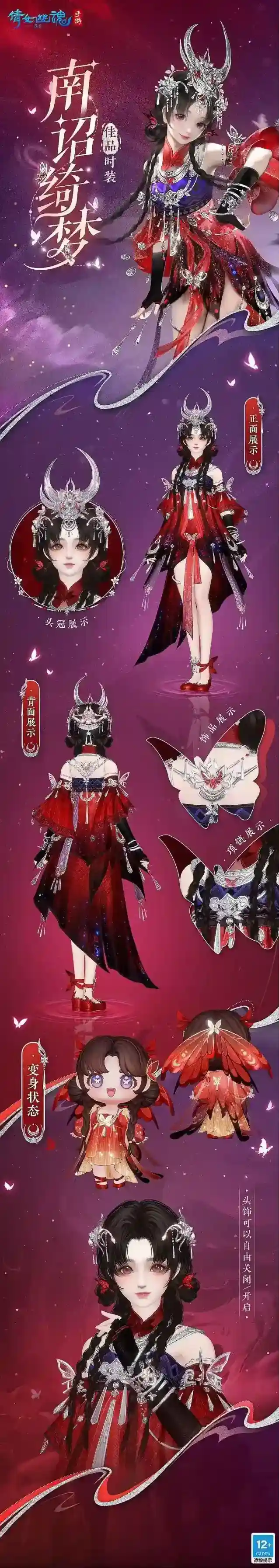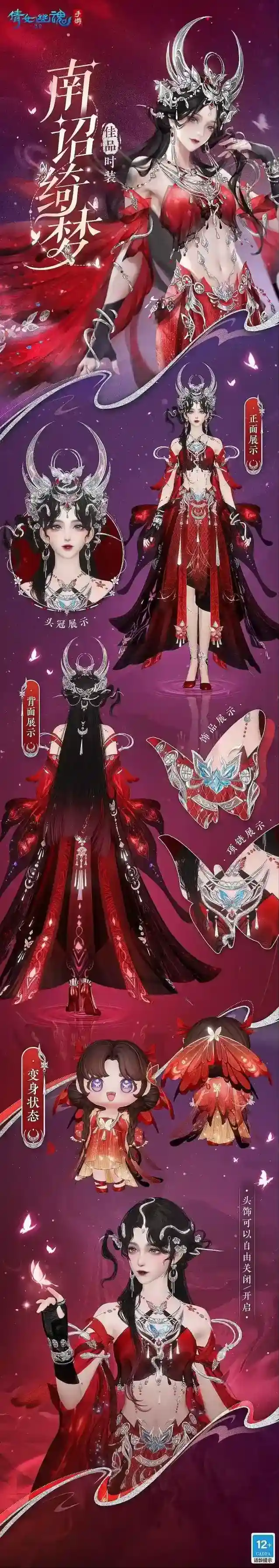 南诏绮梦成女款黑发赤瞳,深邃的眼眸充满着未知的神秘让人忍不住沦陷。黑色薄纱与银饰相互点缀,为全身的红衣增添了几分别样风情。蝴蝶饰品镶嵌着蓝宝石,如同澄清的湖水正散发着幽幽荧光。裙身的蟒蛇纹路野性热情,时刻散发着魅惑气息。