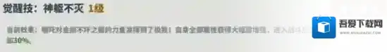 描述:哪吒对金刚不坏之躯的力量发挥到了极致!自身全部属性获得大幅度增强,进入战斗后生命、攻击、暴击各增加30%。