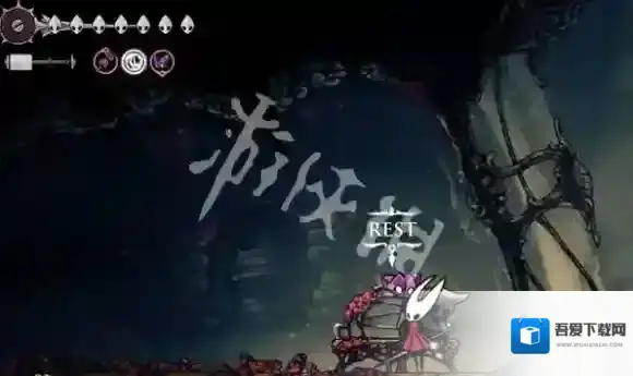 2、简易钥匙门02:解锁冲刺后,可以穿过熔岩区域在深坞找到这扇门,此区域可以获得许多念珠奖励,同时右上角可以开启通往远野的近路,以及获得工具燧石板。