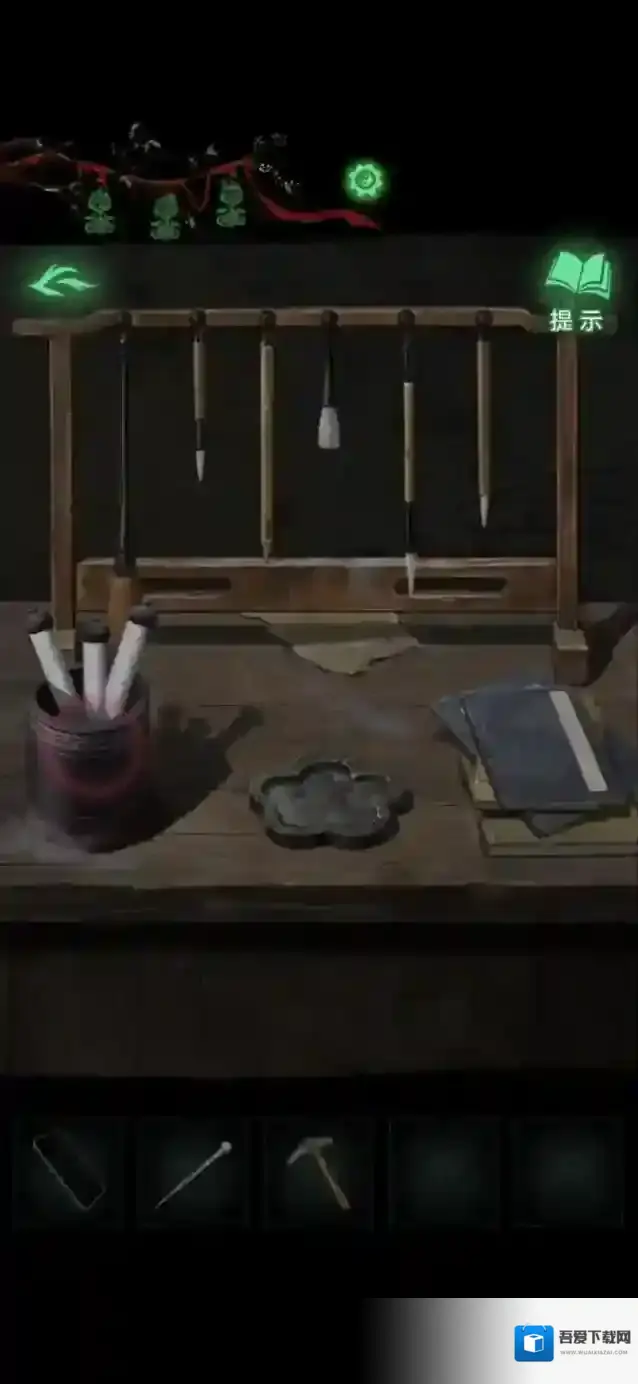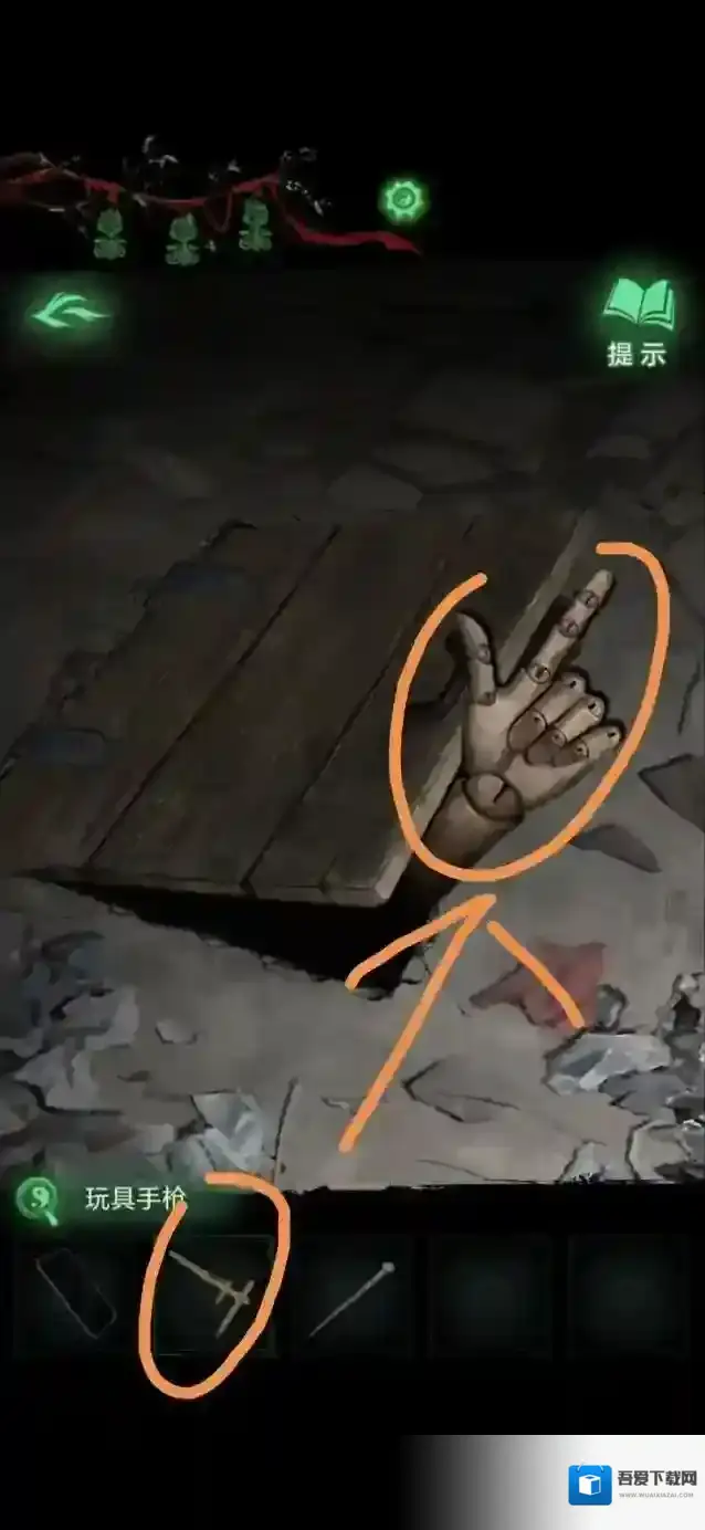 进屋,点击地上的门,把手枪给假手,获得直尺