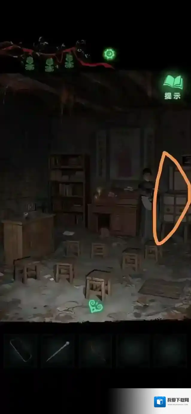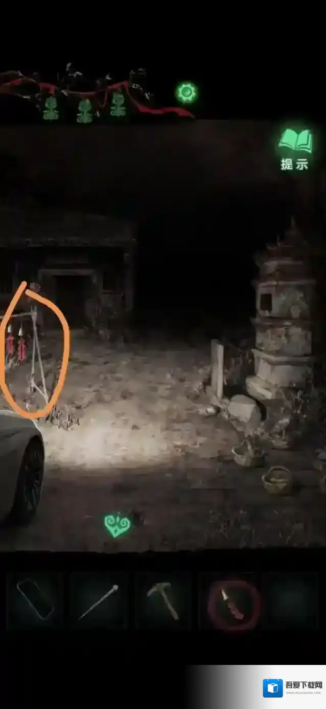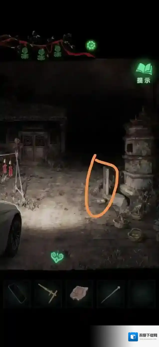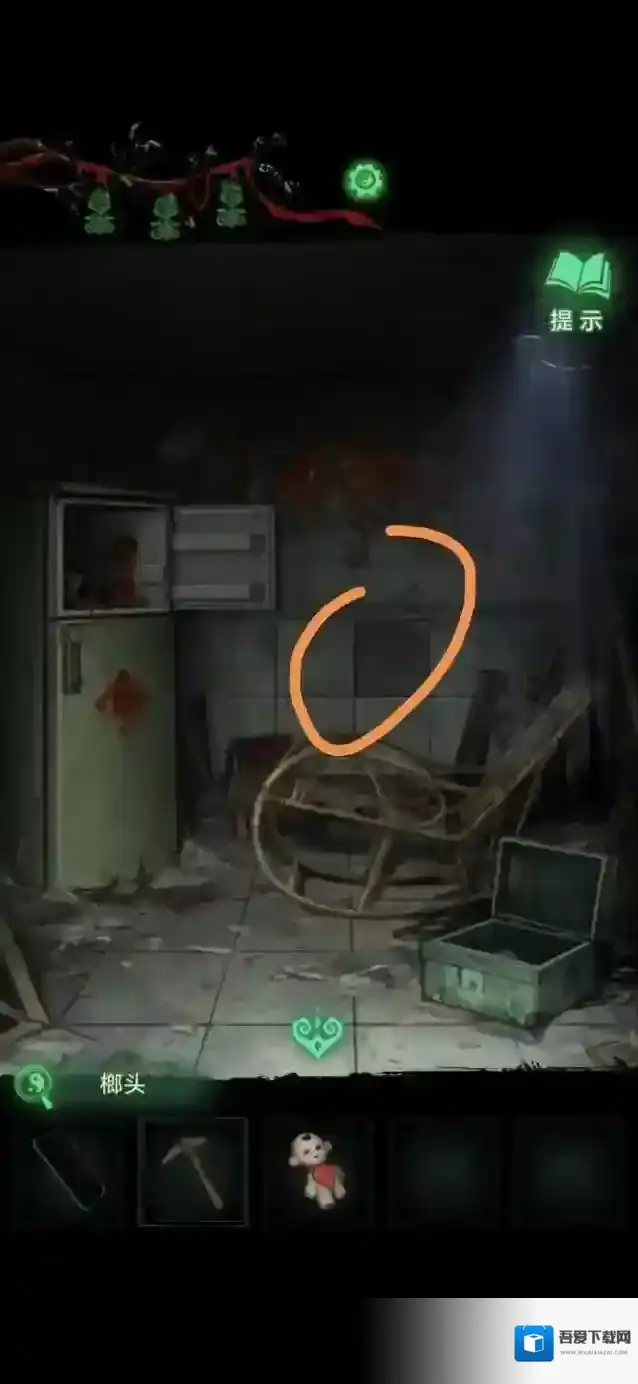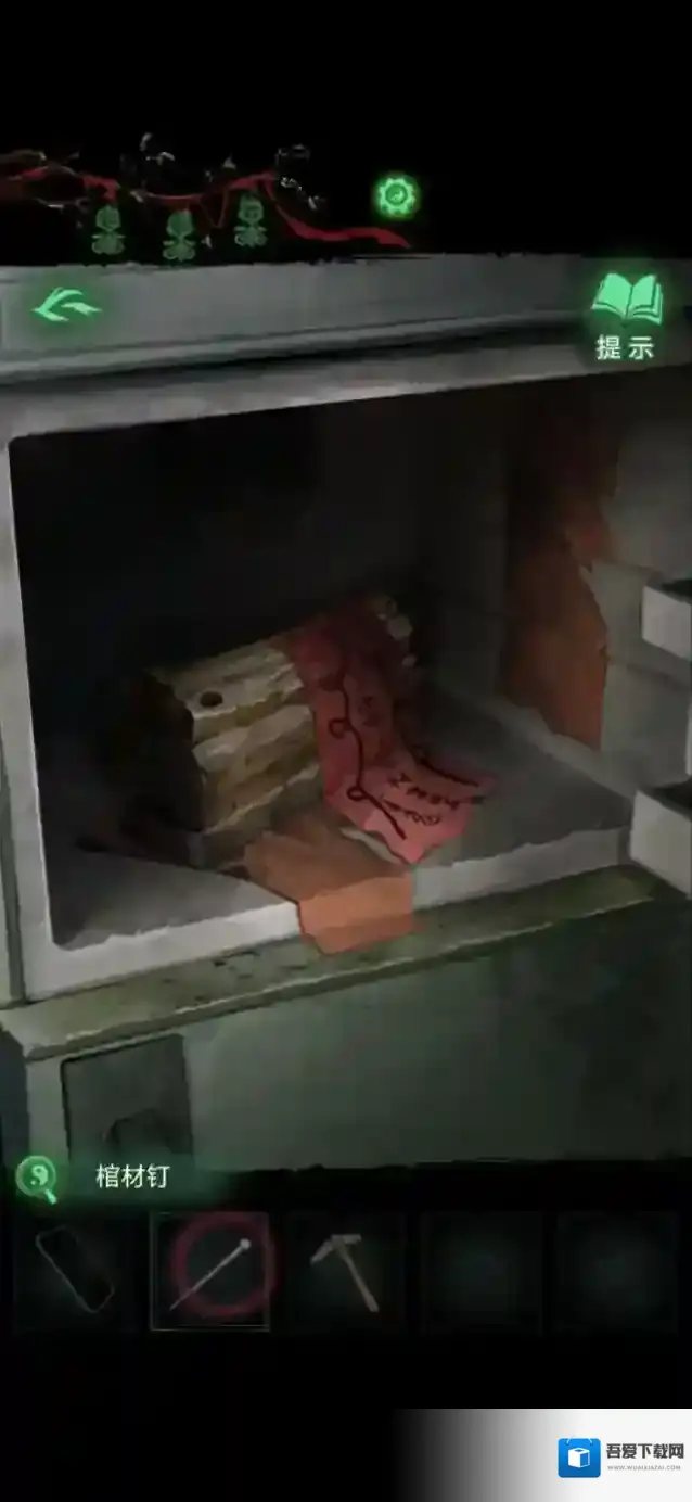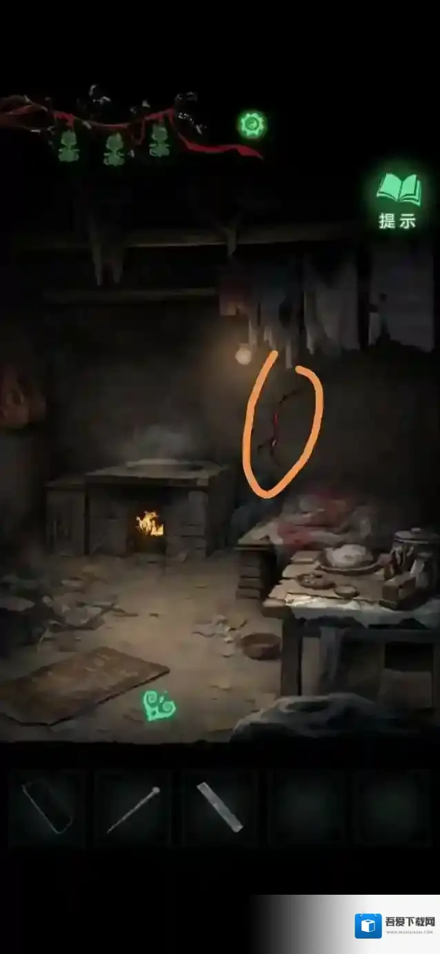 点击获得房间里的晾衣杆,用晾衣杆捅房梁上的布娃娃,娃娃掉在炉灶里,获得石片和棺材钉
