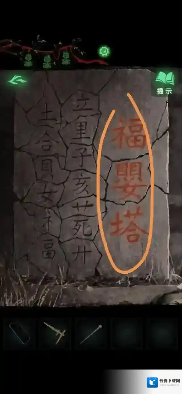 把石片放在碑上,根据福婴塔的偏旁部首点击左边的石片,直到右边字全亮,左边房间门开