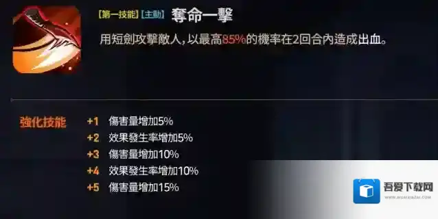 至于她的基础攻击技能“夺命一击”,虽然是单体目标,但也并非简单过渡。该技能有100%概率在两回合内造成出血,配合她的持续输出风格,仍具有不容小觑的战术价值。再结合其专属神器“杀手的庇佑”,不仅能提高效果命中,还可为目标附加一回合烧伤(冷却两回合一次),强化她的持续压制能力。
