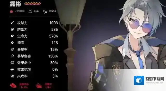 露彬的基础面板表现均衡,生命值与攻击力处于射手职业中较为优秀的水准,使她既具备良好的输出能力,也具备一定的生存能力。她的核心技能之一是“枪弹洗礼”,这是一个全体攻击技能,在命中敌方后,会延长其身上除无法移动类以外的所有弱化效果持续时间,并有100%的概率在两回合内施加防御力降低。这一机制在面对依赖强化效果或存在关键减益持续时间控制的敌人时极具战略价值。