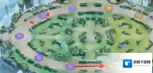 3、让队友站至图中的红色方框处,并且抢夺该处的野怪,之后再去箭头处投分。