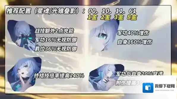 刻律德菈推荐4种配置:1金00、2金10、3金11、8金61,不推荐01配置。1魂效果特殊,提供2点回能,可为白厄增叠1层火种,16/36%无视防御提升那刻夏减防区。综合提升20%左右。