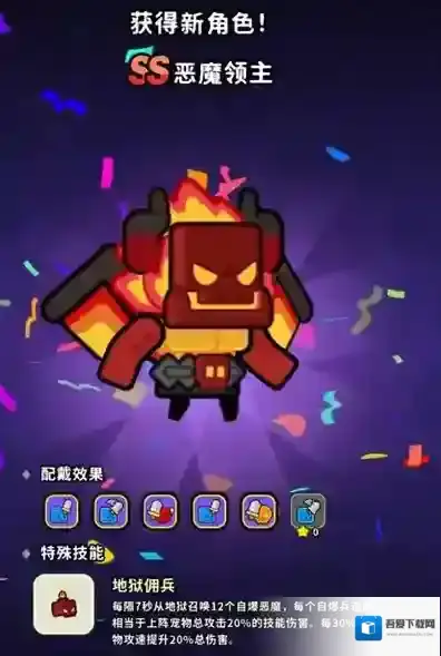 技能:每7秒召唤12个自爆恶魔,每个造成上阵宠物总攻击20%的伤害。**宠物攻速属性每达到30%,总伤害提升20%。