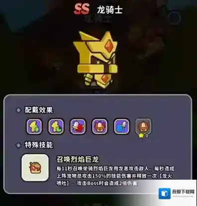 技能: 每11秒召唤烈焰巨龙,喷吐龙息,每秒造成上阵宠物总攻击150% 的巨额范围伤害,对Boss造成双倍伤害。
