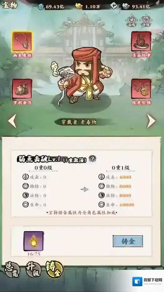 2、铸金玩法,只有红色品质宝物,才可以进行铸金,每个阶段内升级消耗相应的材料,随着法宝铸金等级的提升,消耗也会随之增加,但是所获得的属性提升也是最大的