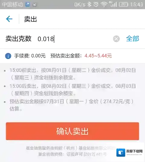跳转到这个页面之后,小编输入了想要卖出的克数,系统就会自动计算出能够卖出的价格在4.45–5.44元之间,并且不需要手续费,到账时间下面也有明确的显示;