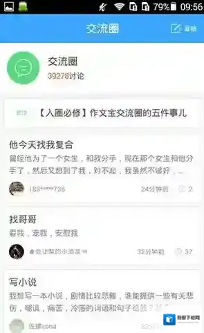 3、点击作文宝界面下方的交流圈选项,在交流圈界面中可以看到当前一些作文宝用户在写作素材方面的讨论,贴,如果你有想写的题材要和别人交流,可以点击交流圈界面右上角的发帖按钮,如下图。