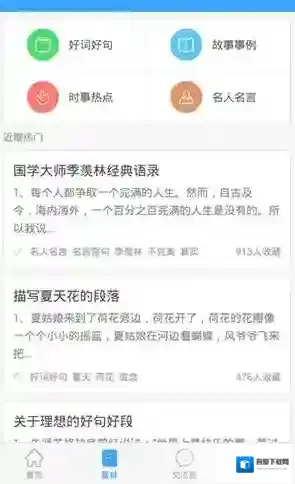 2、点击作文宝界面下方素材这个功能选项进入到素材库界面,可以看到一些一些近期热门的素材,当然你还可以根据自己的需要选择,有好词好句、故事事例、时事热点、名人名言。