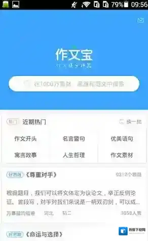1、打开作文宝客户端,进入到作文宝主界面后,可以看到一些近期热门写作的素材和一些写作思路介绍,如果你有特别想要参考的素材,还可以通过搜索得到。