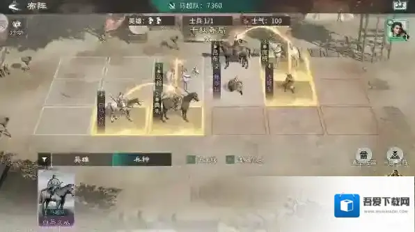 这里赵云依旧没有追击格,暂不考虑使用,我们选择马超站在第二行对上敌方藤甲兵,典韦站在马超的追击格上,白马义从站在典韦的追击格上,这样站在最下方的白马义从和典韦,可以与马超一起集火击杀敌方士兵,快速让敌方减员,从而拿下胜利。