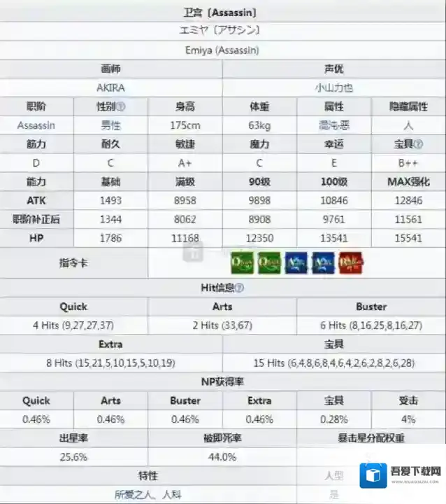 从基础面板来看的话,切嗣的攻击力即使在80级配满银芙芙的情况下也不能破万,即使是在四星从者里面也算是偏低的了,而且杀阶本身的攻击系数就低,可以说是比较惨了。指令卡的话,切嗣的绿卡和红卡以及ex卡的hit数都很高,所以本身切嗣的打星能力倒是很强,但是切嗣不知道是哪里招惹了数值策划,其np率被特意削过,在全从者中也属于垫底级别,指令卡的np获取能力根本属于重度残疾级别,这也算是游戏早期的遗留问题了,到现在也没有看到解决的希望…