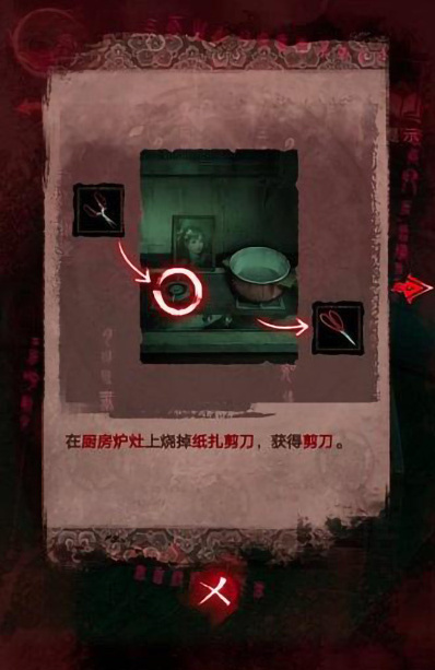 19、我们到厨房将纸扎剪刀放到炉灶上面烧掉,获得一把剪刀。