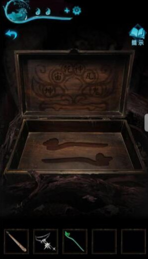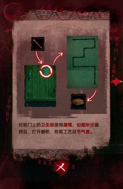 27、然后我们使用眉笔对柜门卫生纸画符,按照如图所示的样式绘画即可打开橱柜,开启后即可获取工艺品节气盒。
