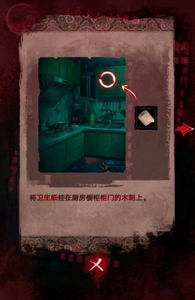 26、我们获取卫生纸后前往厨房,将卫生纸挂在厨房上的橱柜柜门木刺上。