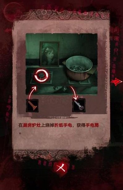 23、我们前往厨房,在厨房炉灶上烧掉折纸手电即可获得手电筒。