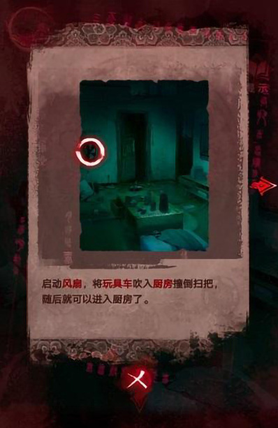 12、我们打开风扇,玩具车就会被吹入厨房,之后就会撞到扫把,我们就可以进入厨房了。