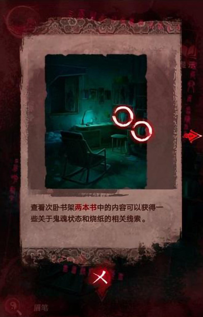 8、我们查看书架两本书的内容,从中获得一些关于鬼魂状态以及烧纸的内容。