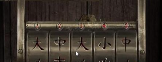 9、接着在妹子下去后男人调节福字机关的字,我们根据柜子上的字输入答案,答案就是死丧生死,男人即可获得凿子。