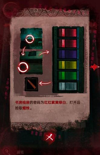 10、我们使用颜色顺序,打开书房抽屉,密码是红红紫黄绿白,打开后即可获得一个蜡烛。
