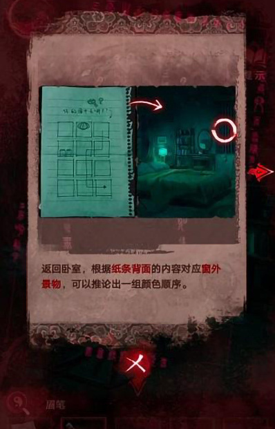 9、我们返回卧室,根据纸条背面内容对应窗外景物,即可获得一组颜色顺序。