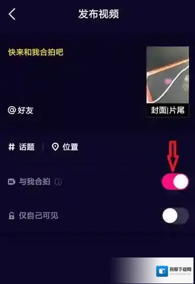 然后进入到视频发布界面,找到与我合拍选项,滑动后面的开关。