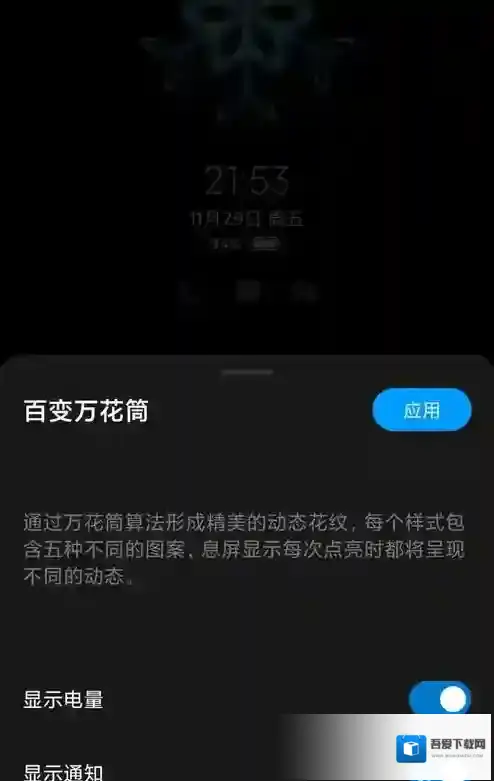 5、我选择了百变万花筒里的一个比较炫酷的动态花纹。点击应用,电量显示和显示通知是默认开启的,也可以设置将它们关闭。