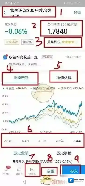 4的位置是当前基金买入时候收取的手续费,指数基金手续费大都是1.2%,现在互联网代售平台都是打一折的哦,一般银行是打八折,想想看这区别。什么都没做,你就比银行购买的人多收益了1.08%,所以银行买基金的行为该淘汰啦。。