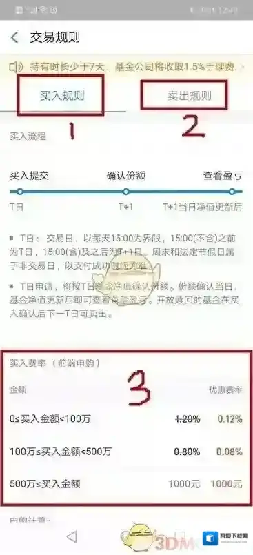 2的位置卖出规则,一般是0-7天收费1.5%最高,所以建议最低持有7天以上哦。7-1年一个档次,1年-2年一个档次。2年以上一个档次,卖出费用最低。