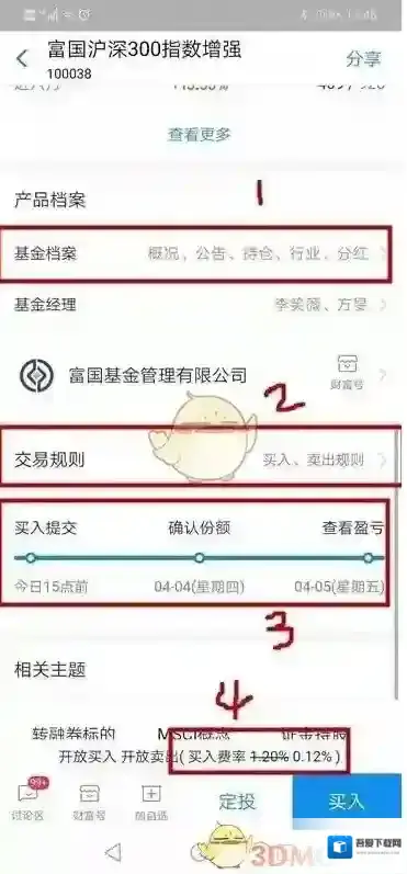 3的位置买入和确认时间节点,一般普通基金,交易日15点前买入的话,以当天净值结算你的买入价格,15点后的话只能算第二天净值价格买入的。这点大家要注意交易时间,然后下一个工作日确认份额,意思就是基金公司给你一个确认收到的准确信息意思。