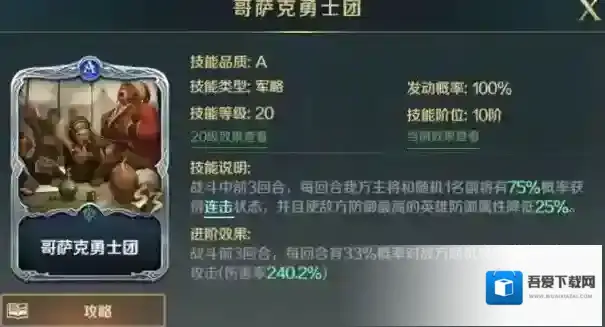 军略技能,使我方主将和随机副将概率获得连击,同时降低敌方坦克防御属性,搭配天命拉格纳的自带技能,大幅度提高队伍的倒坦能力。