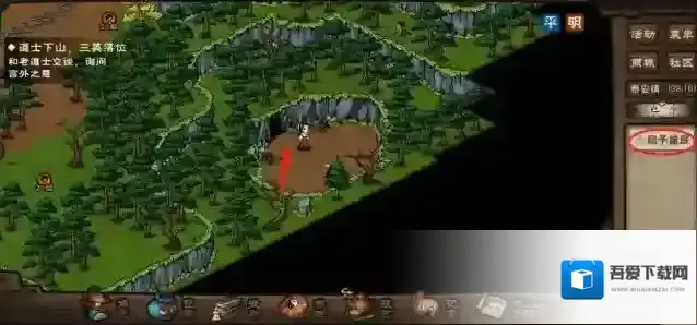 进入山洞后跟着主线剧情的小箭头走,打败山洞中蛇怪救出叶神机,然后在(28,16)这里点击搜索,会出现一个机关,点击”启动机关“,就可以打开(26,15)的出口。
