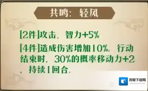 4件套效果:造成伤害+10%,行动结束时,30%概率下回合移动力+2。