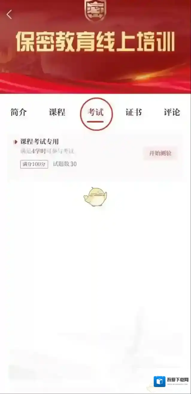 3、当学完4学时后,点击“考试”,参加测试。考试时间20分钟,共30道题,其中单选20道,判断10道。考试成绩满分100分,优秀90分,合格60分。如果成绩不合格,可再次进行考试。