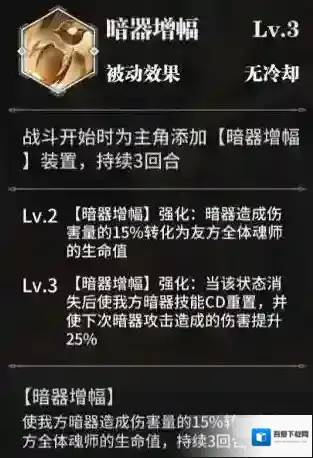 三级技能时当暗器增幅的状态消失后使我方的暗器技能CD重置并使下次暗器攻击的伤害提升25%