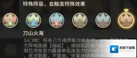 同时触发刀山火海的羁绊己方魂师每次攻击时20%几率在敌方阵地生成熔岩效果,使在熔岩的敌方每回合受到己方攻击力最高的单位攻击时无视20%防御,熔岩持续2回合。