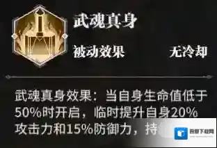 效果:当自身生命值低于50%时开启,临时提升自身20%攻击力和15%防御力,持续4个回合