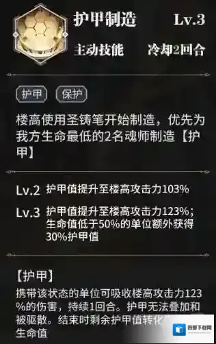 给两名生命最低的魂师套一个护盾,三级的时候强化该技能对生命值低于50%的单位额外获得30%的护盾值,回合结束后剩余的护盾值转化为对应值的生命回复(意思就还剩多少护盾值就回多少血),护盾无法叠加也无法被驱散