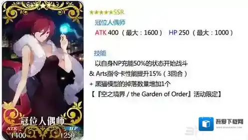 装备期间限定概念礼装「★5(SSR)老成之翁」「★5(SSR)冠位人形师」「★4(SR)歪曲之魔眼」「★4(SR)鲜艳拳舞」「★3(R)短跑运动员」「★3(R)Repeat Magic」可以让本次活动副本内掉落的活动专用道具「黑猫模型」「草莓冰淇淋」「矿泉水」的掉落数增加。