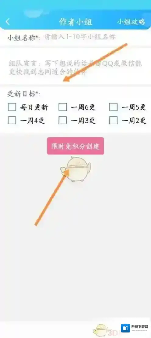 4、输入小组名称、组队宣言,选择更新目标,点击创建即可。
