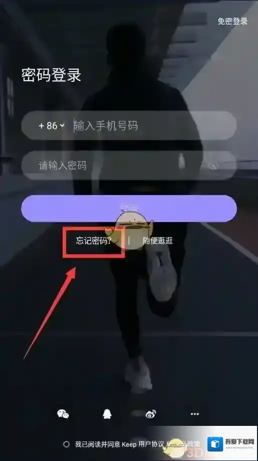 1、打开keep,在登录页面点击“忘记密码”