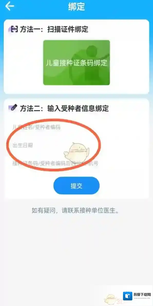 2、登录成功后回到金苗宝首页,点击右上角“绑定”,使用方法一或者方法二绑定儿童信息,见下图。