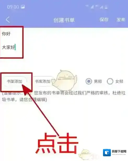 4、进入编辑页面之后,设置书单名称和简介,之后点击“书架添加”。