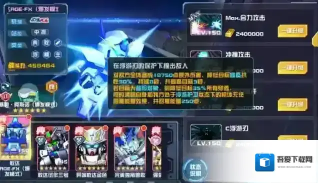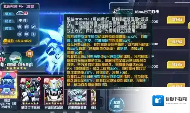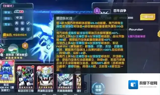 当我方上阵5台主角型或5台浮游型机体时,我方机体使敌方无法回复耐久后,清除我方全体无法回复耐久效果,并为我方全体回复耐久,回复量为敢AGE-FX(爆发模式)耐久上限的20%,同时提升我方全体攻击频率25%,持续8秒,冷却10秒。