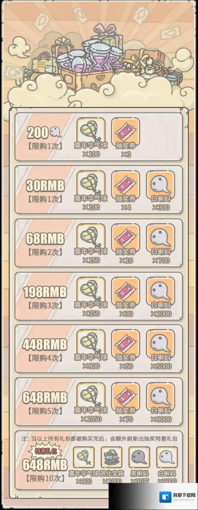内容为:白蝌蚪×20、抽奖券×3、嘉年华气球×100