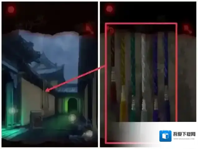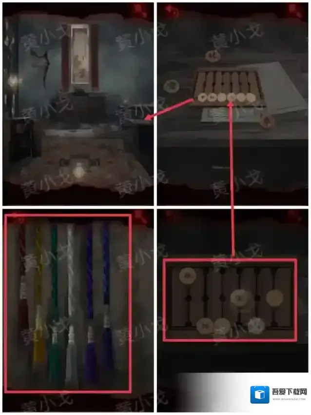 9.点击右侧柜子上的棋盘,根据棋子颜色,结合[过道]场景经幡的颜色及高度线索,调整对应棋子的位置